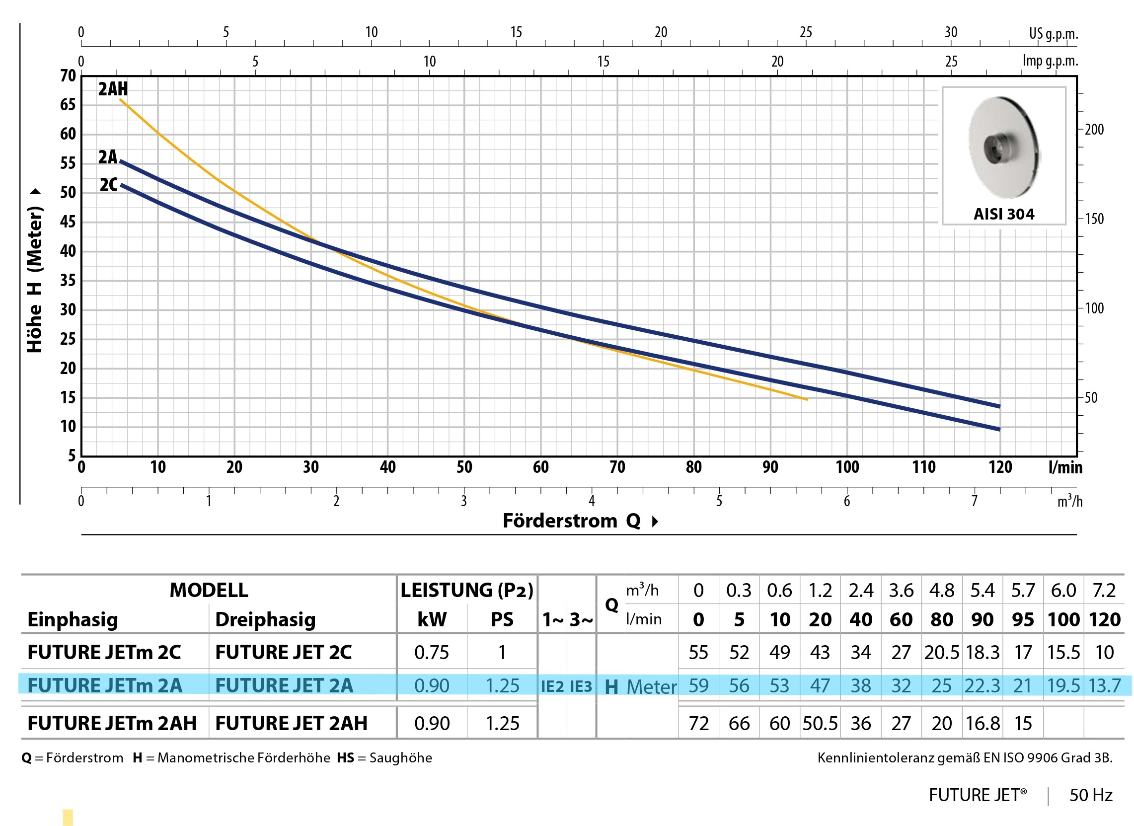 - Hohe Förderleistung bei stabilem Druck (Max. 120 l/min, Max. 56 m Förderhöhe, 0,90 kW / 1,25 PS)