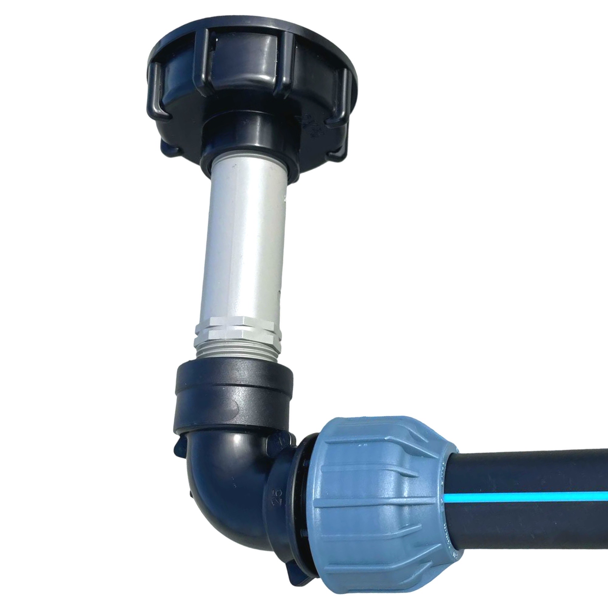 Einfache Montage: Passend für alle Standard IBCs. Einfach anschrauben, Rohre auf benötigte Länge kürzen, verbinden, fertig!
